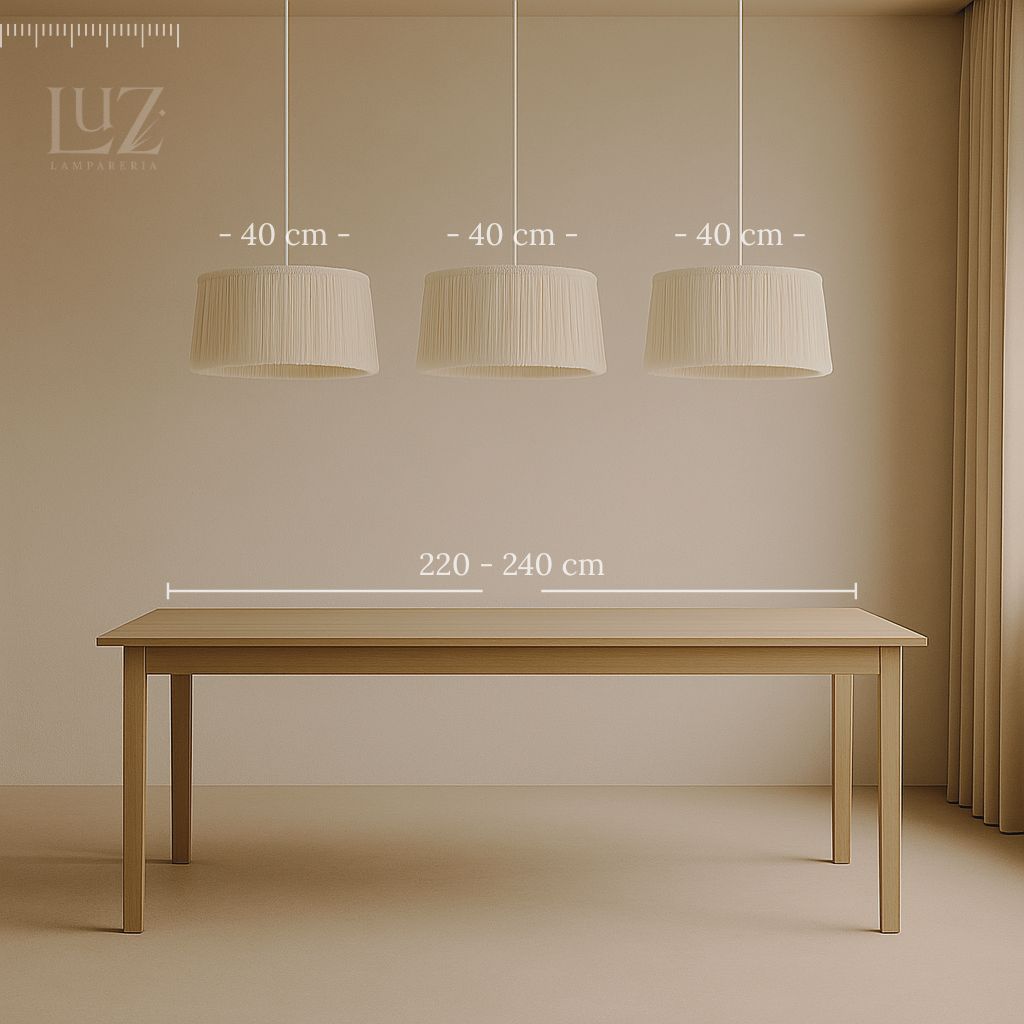 No existe una única medida correcta, pero podemos orientarnos con una fórmula sencilla, a modo de guía, que ayuda a mantener la armonía visual entre tu ambiente y la lámpara elegida.