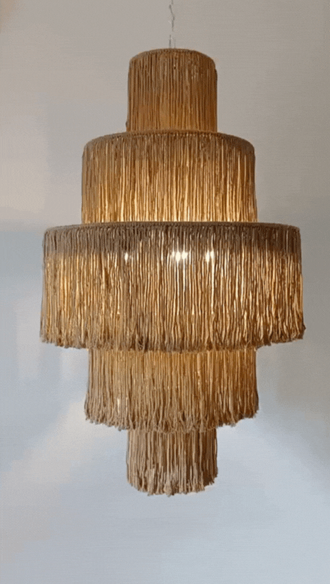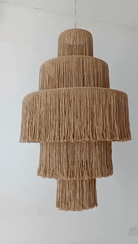 Es una lámpara colgante de cinco niveles, tejida a mano con cordón 100% algodón, que equilibra la delicadeza del trabajo artesanal con una estética bohemia y sofisticada.